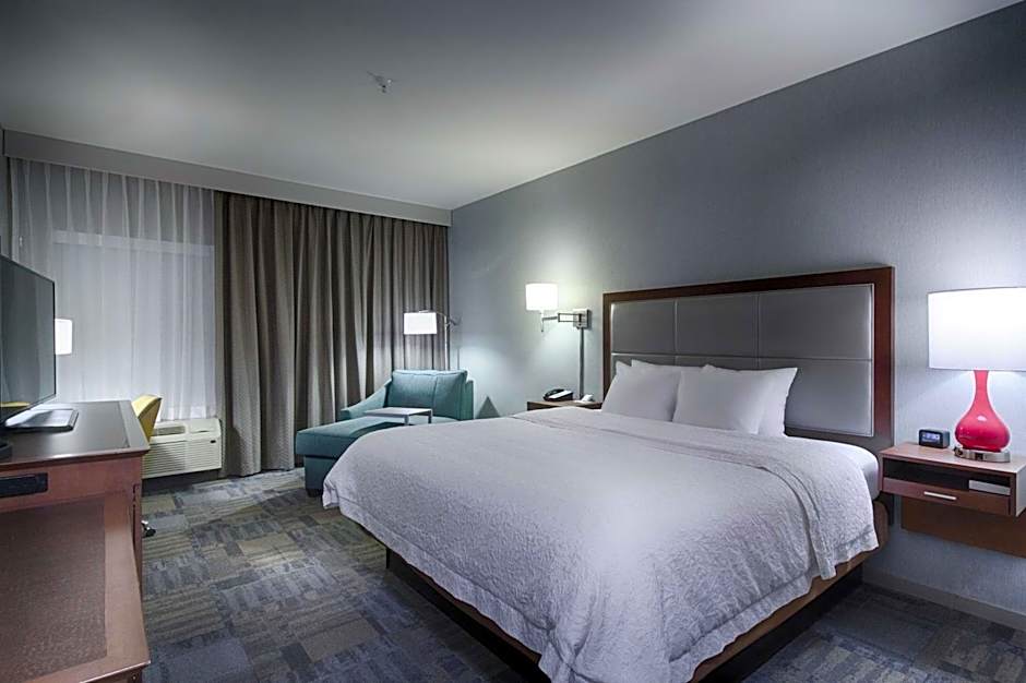 This room features a flat-screen TV, microwave, and small refrigerator. A small seating area with recliner and ottoman.